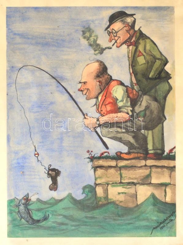 Smiánich (?) Alajos 1941. jan. 13. jelzéssel: Botra akadt cipő (Pecázó... https://www.darabanth.com/hu/374-Gyorsarveres/374.0/Festmenyek-es-grafikak/Festmenyek-es-grafikak~1/Smianich-Alajos-1941-jan-13-jelzessel-Botra-akadt-cipo-Pecazok-karikatura-Akvarell-~II2187754