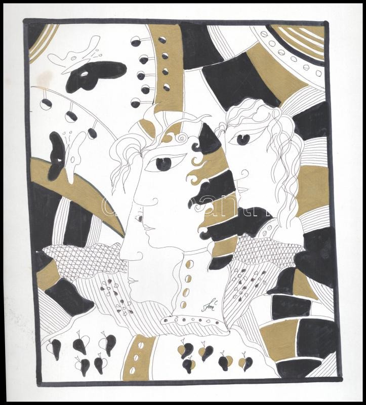 Leírás: Szász jelzéssel: Lányok pillangóval. Akril, papír. 28x24 cm