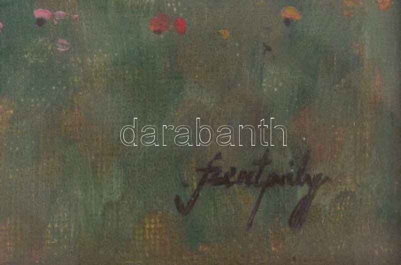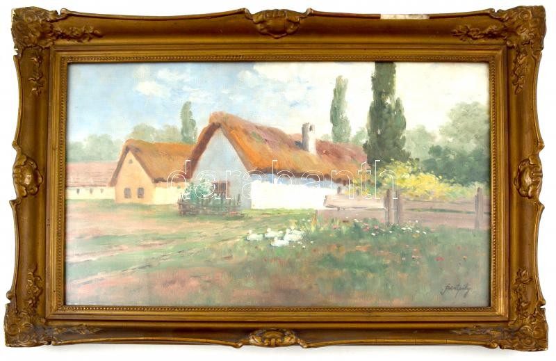 Leírás: Szentpály Zoltán (?-?): Házsor libákkal. Olaj, falemez, jelzett, üvegezett sérült, régi keretben, 25×39 cm