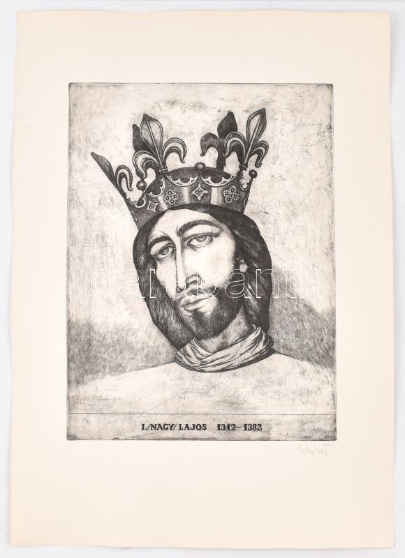 Leírás: Szunyoghy András (1946-): I Nagy Lajos magyar király, rézkarc, papír, jelzett, 39×29 cm