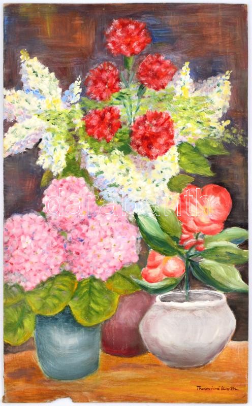 Leírás: Thormáné Kiss M. jelzéssel: Csendélet. Olaj, farost, alján sérült, hiányos, 67,5×41 cm