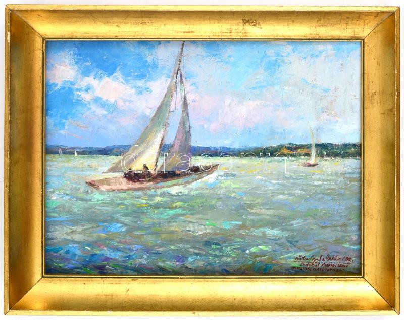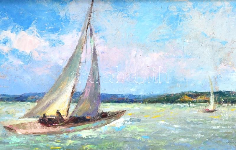 Leírás: Wéber Gyula (?-?): Balatoni vitorlások. Ola, vászon, jelzett, ajándékozási sorokkal, fa keretben, 31×41 cm