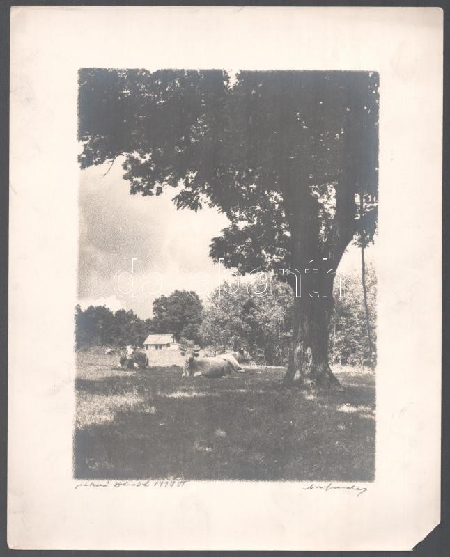 1934 Orphanidesz János (1876-1939): Pihenő ökrök, aláírt, művészfólián keresztül fényképezett fotóművészeti alkotás, a papír szélei kissé foltosak, egyik sarkán kis hiány, de a lényegi részt nem érintik, 23×16,5 cm