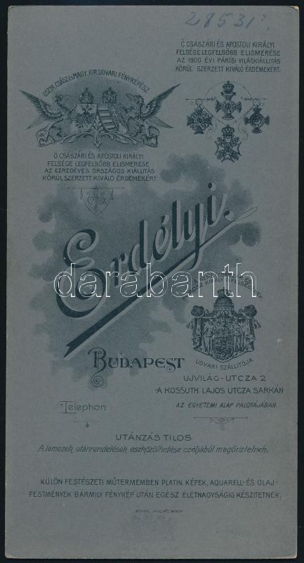 cca 1890 Budapest, Erdélyi Mór (1866-1934) császári és királyi udvari fényképész műtermében készült, keményhátú vintage fotó, ez a műterem 28531. számmal jelzett felvétele, 20,3x10,8 cm