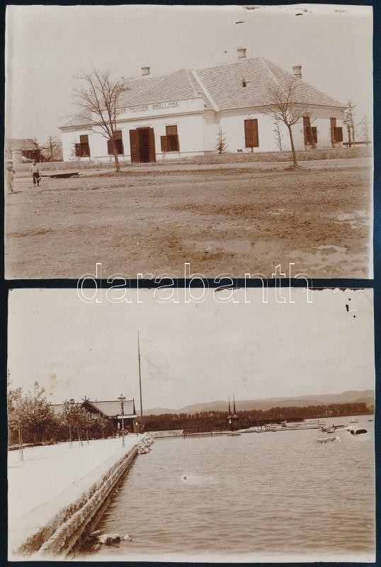 Leírás: cca 1900 Balatonberény, Magyar Tenger Szálloda és Csónakázó és Korcsolyázó Egylet épülete, 2 db fotó, 8,5×11,5 cm