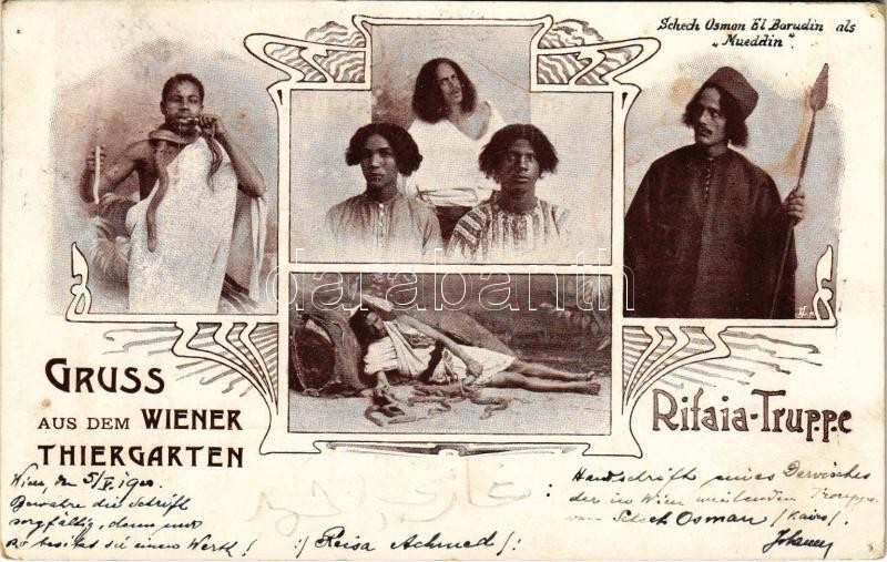 1900 Wien, Vienna, Bécs; Gruss aus dem Wiener Thiergarten, Rifaia Truppe. Schech Osman El Barudin als Mueddin / Viennese human zoo, Muslim folklore. Art Nouveau (tiny pinholes)