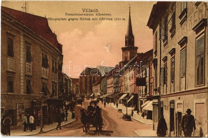 Leírás: 1913 Villach, Fremdenzentrum Kärntens, Hauptplatz gegen Süden mit Görlitze / main square, shops (EK)