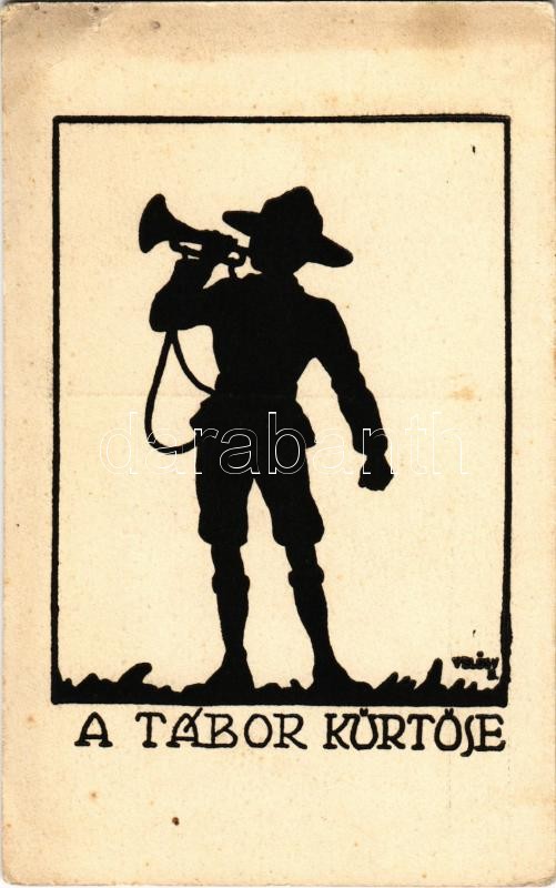Leírás: A tábor kürtöse. A KEG (Katolikus Egyetemi Gimnázium) cserkészcsapatok kiadása / Hungarian boy scout art postcard s: Velősy B. (EB)