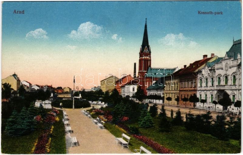 Arad, Kossuth park, templom. Kerpel Izsó kiadása / park, church https://www.darabanth.com/hu/374-Gyorsarveres/374.0/Kepeslapok/Erdely~2000005/Arad-Kossuth-park-templom-Kerpel-Izso-kiadasa-park-church~II2192035