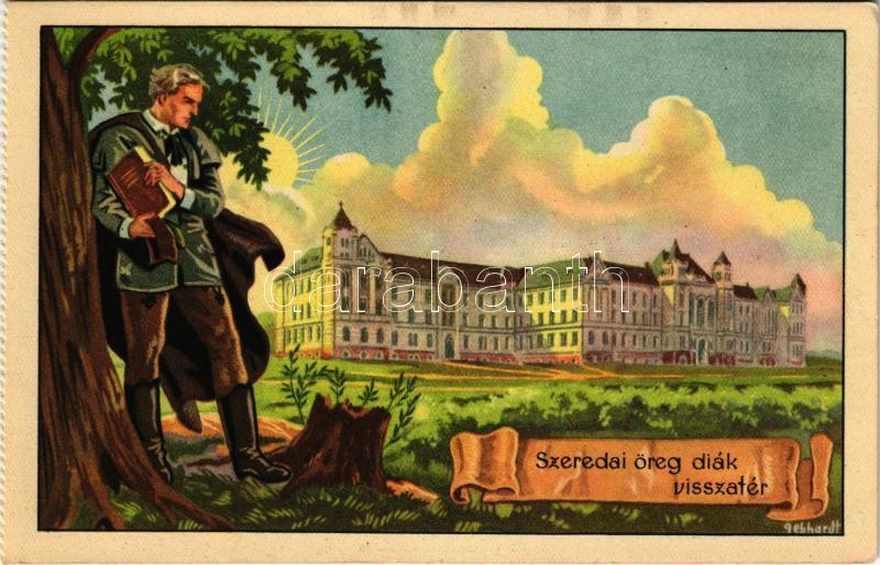 Csíkszereda, Miercurea Ciuc; "Szeredai öreg diák visszatér", Római katolikus gimnázium. Kiadja a Székely Egyetemi és Főiskolai Hallgatók Egyesülete / Hungarian irredenta art postcard, Catholic high school s: Gebhardt - képeslapfüzetből / from postcard booklet