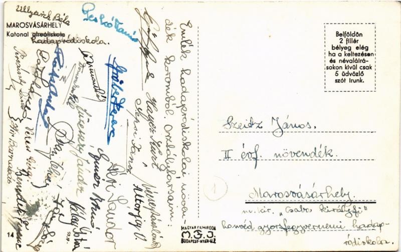 Marosvásárhely, Targu Mures; Katonai alreáliskola (hadapródiskola), hátoldalon az évfolyam osztálytársainak aláírásával / K.u.k. military cadet school. Signatures on the backside