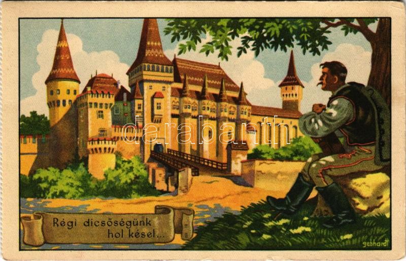 Leírás: Vajdahunyad, Hunedoara; "Régi dicsőségünk hol késel..." Kiadja a Székely Egyetemi és Főiskolai Hallgatók Egyesülete / Cetatea (Castelul) Huniadestilor / Hungarian irredenta art postcard, castle s: Gebhardt - képeslapfüzetből / from postcard booklet