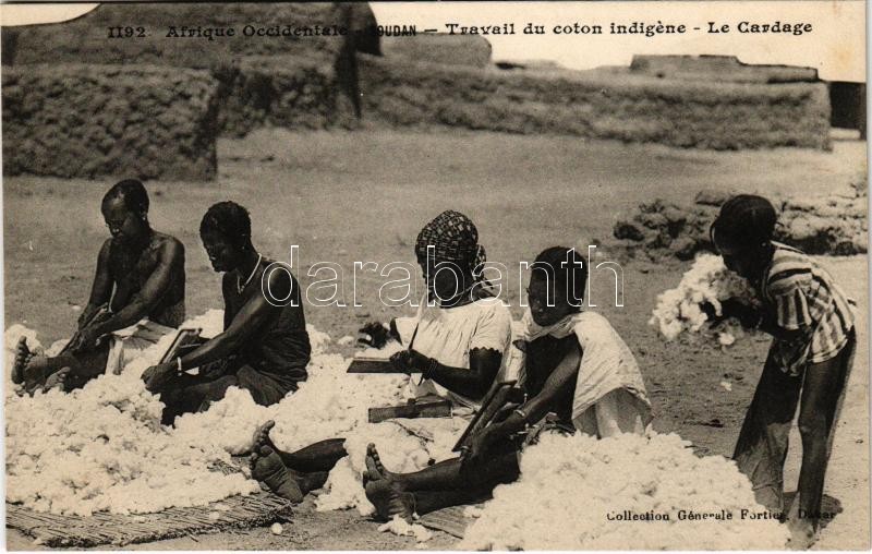 Travail du coton indigéne, Le Cardage / native cotton workers, carding... https://www.darabanth.com/hu/374-Gyorsarveres/374.0/Kepeslapok/Folklor~2000073/Travail-du-coton-indigene-Le-Cardage-native-cotton-workers-carding-French-Sudan~II2174135