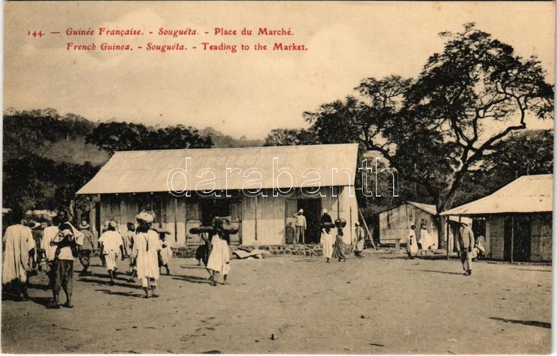Souguéta, Guinée Francaise, Place du Marché / Teading to the Market https://www.darabanth.com/hu/374-Gyorsarveres/374.0/Kepeslapok/Guinea~2000032/Sougueta-Guinee-Francaise-Place-du-Marche-Teading-to-the-Market~II2178673
