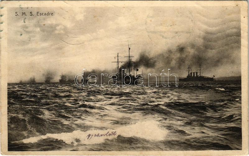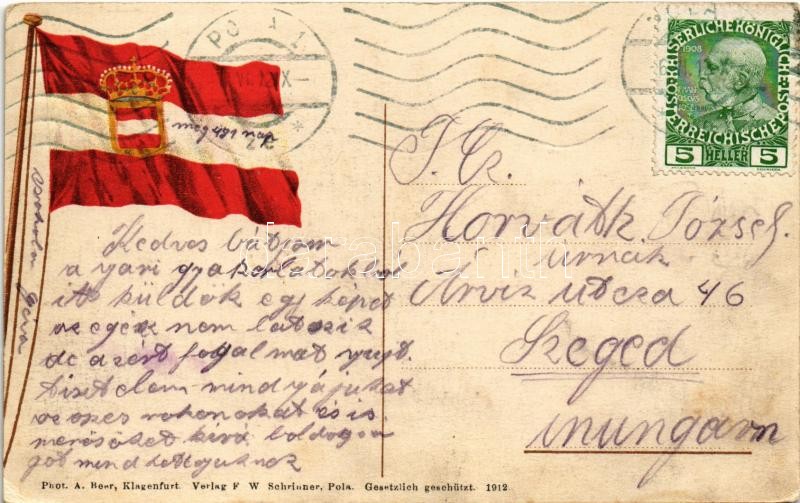 1912 SMS Escadre / Az Osztrák-Magyar Haditengerészet hajóraja a tengeren / Austro-Hungarian Navy, K.u.K. Kriegsmarine naval squadron at sea. Litho naval flag on the backside. Phot. A. beer. Verlag F. W. Schrinner, Pola (fl)