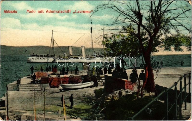 Leírás: Abbazia, Opatija; Molo mit Admiralschiff Lacroma. K.u.K. Kriegsmarine / SMS Lacroma (Ex-Tiger) osztrák-magyar haditengerészet yachtja (ex-Panther-osztályú torpedócirkálója)