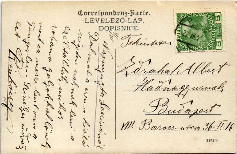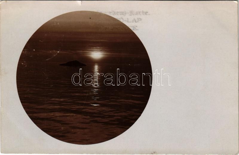 Napnyugta Leszinánál. "Dalmácia ezen a kiálló szigetén szoknak lenni a céltáblák, mikor robbanó golyókkal lőnek mert ez messze lent van a tengerben" / WWI Austro-Hungarian Navy, K.u.K. Kriegsmarine, small Dalmatian island used for shooting practice by mariners, sunset over Lesina (Hvar). photo (apró szakadás / tiny tear)