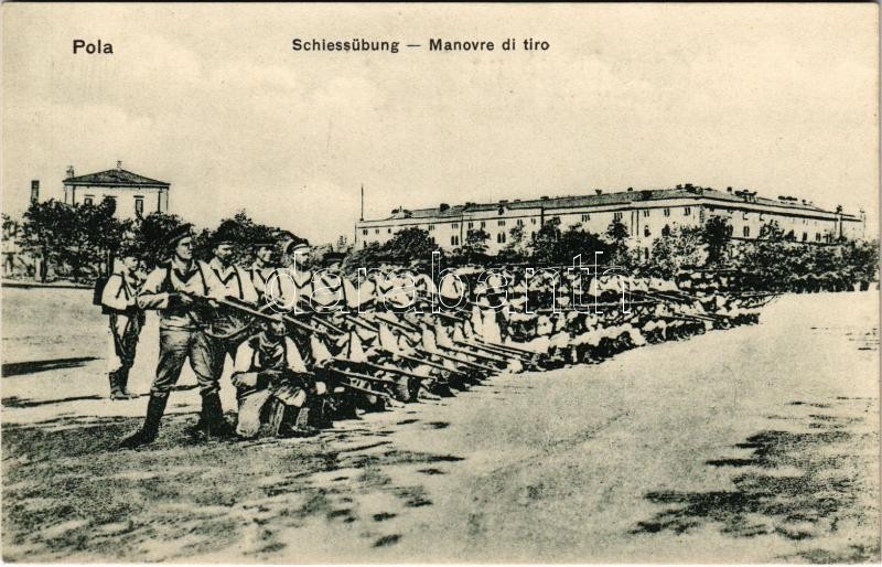 Pola, Pula; osztrák-magyar matrózok szárazföldön lőgyakorlat közben / K.u.K. Kriegsmarine Schiessübung / Manovre di tiro / Austro-Hunmgarian Navy shooting practice, mariners on main land