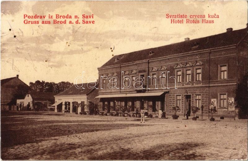 Bród, Nagyrév, Slavonski Brod, Brod an der Save; Vörös ház szálló, tér, C. Bencevic és Milan Petrovacki üzlete. W.L. 138. / Svratiste crvena kuca / Hotel Rotes Haus / hotel, square, shops (EK)