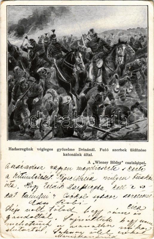 1914 Hadseregünk végleges győzelme Drinánál, futó szerbek üldözése katonáink által. Wiener Bilder csataképei / WWI K.u.K. (Austro-Hungarian) military art postcard (EK)