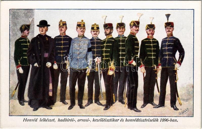 Leírás: Honvéd lelkészet, hadbírói-, orvosi-, kezelőtisztikar és honvédtisztviselők 1896-ban. Honvédség története 1868-1918 / Austro-Hungarian K.u.K. military art postcard, Hungarian officers s: Garay