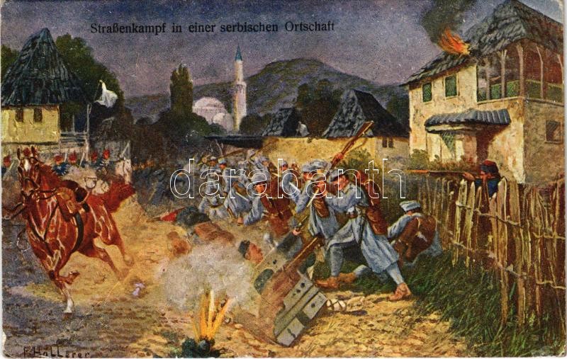 Leírás: Strassenkampf in einer serbischen Ortschaft / WWI K.u.K. (Austro-Hungarian) military art postcard s: Höllerer