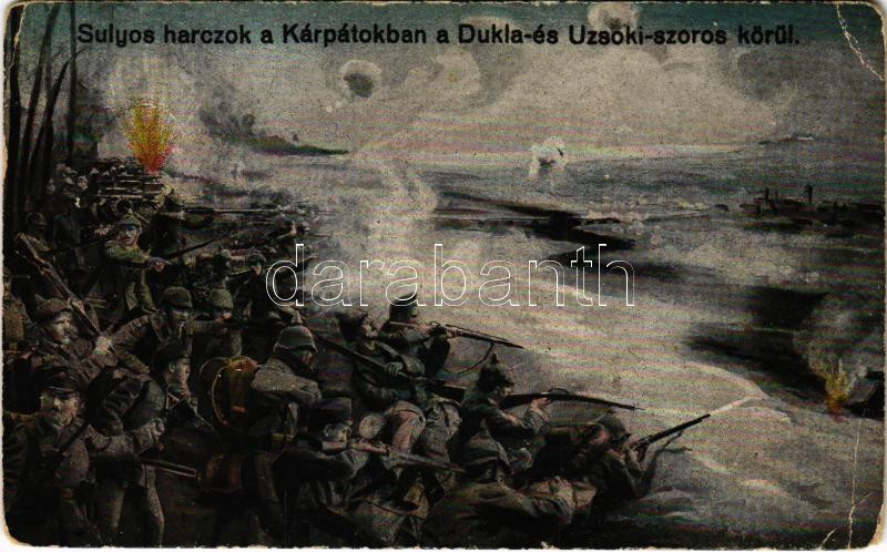 Súlyos harcok a Kárpátokban a Dukla és Uzsoki szoros körül / WWI K.u.K. (Austro-Hungarian) military art postcard + "M. kir. 56. sz. ho. hegyi távbeszélő osztag" (EK)