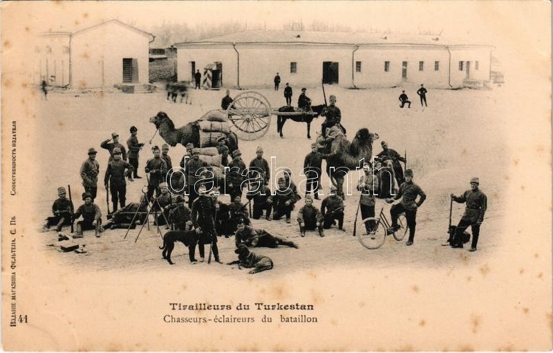 Leírás: Tirailleurs du Turkestan. Chasseurs-éclaireurs du bataillon / Turkestan sharpshooters, scout hunters battalion, soldier with bicycle, rifles, camel (fl)