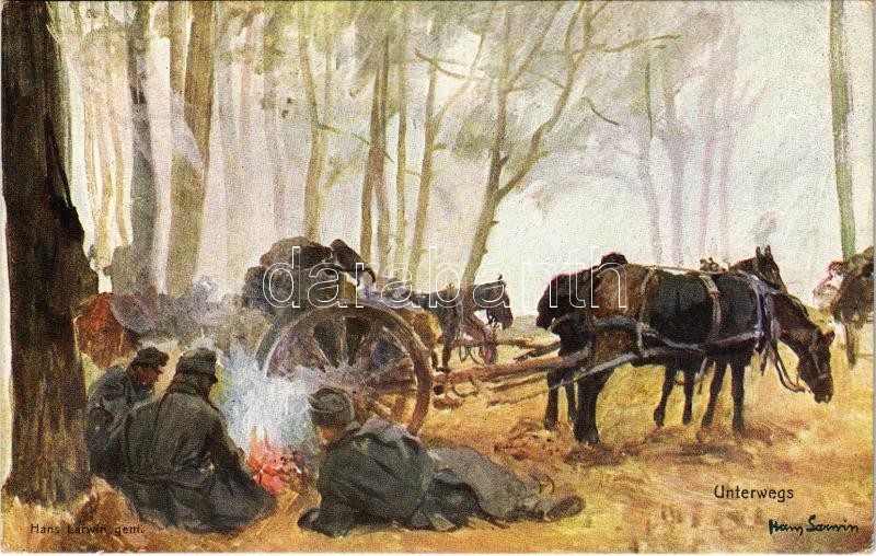 Unterwegs. Offizielle Karte für Rotes Kreuz, Kriegsfürsorgeamt Kriegshilfsbüro Nr. 396. / WWI Austro-Hungarian K.u.K. military, soldiers by the campfire s: Hans Larwin