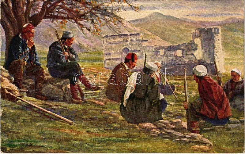Leírás: Weltkrieg 1914-1916 Kriegsrat albanischer Stammeshäuptlinge / WWI K.u.K. (Austro-Hungarian) military art postcard