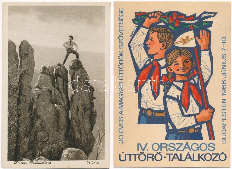 Leírás: 2 db képeslap: 1966 IV. Országos Úttörő Találkozó, Keserűsi Vadállókövek / 2 Hungarian postcards: 1966 4th Hungarian Pioneer movement Meeting