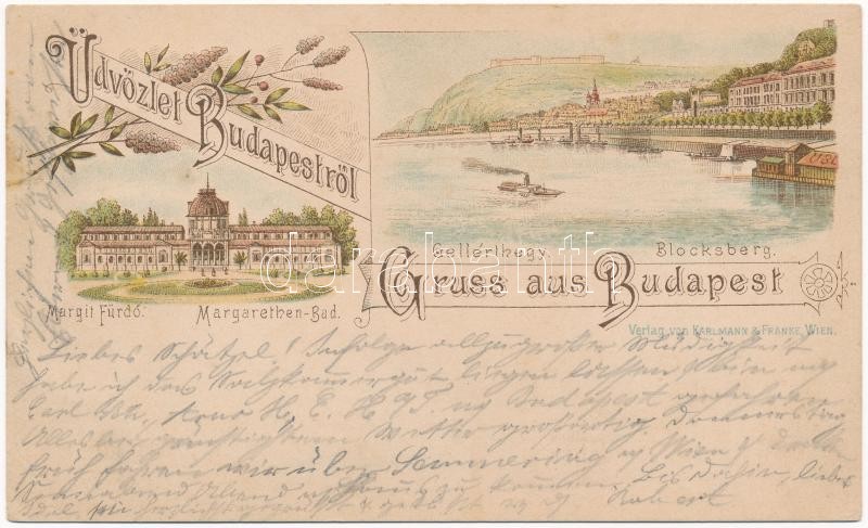 Leírás: 1890 (Vorläufer!!!) Budapest, Margit fürdő, Gellérthegy. Karlmann & Franke. Wien. Art Nouveau, floral, litho (r)