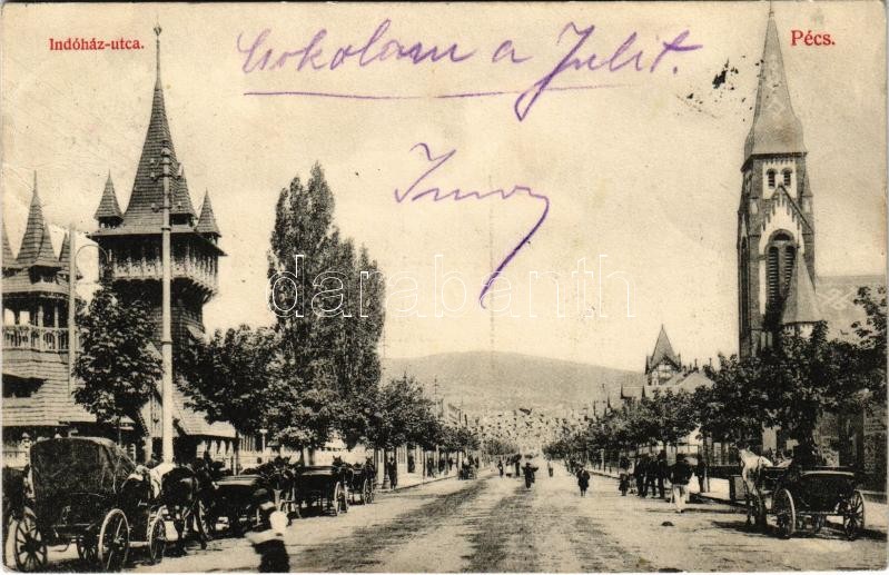 1907 Pécs, Indóház utca, Országos kiállítás főbejárata, lovaskocsik https://www.darabanth.com/hu/374-Gyorsarveres/374.0/Kepeslapok/Magyarorszag~2000004/1907-Pecs-Indohaz-utca-Orszagos-kiallitas-fobejarata-lovaskocsik~II2184599