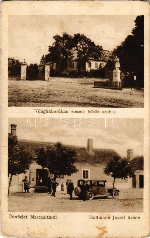 Leírás: 1936 Marcaltő, Világháborúban elesett hősök szobra, emlékmű, utca, automobil, Hoffmann József üzlete és saját kiadása (EB)