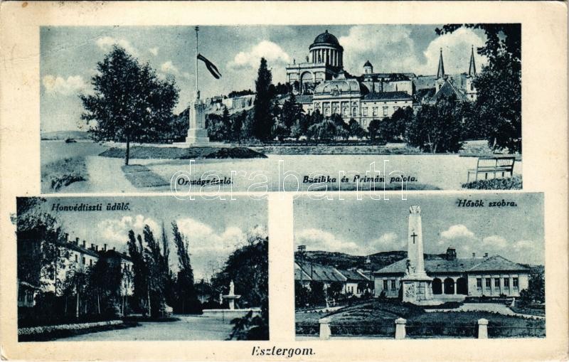 Leírás: 1938 Esztergom, Országzászló, Bazilika és Prímási palota, Honvédtiszti üdülő, Hősök szobra, emlékmű (EK)