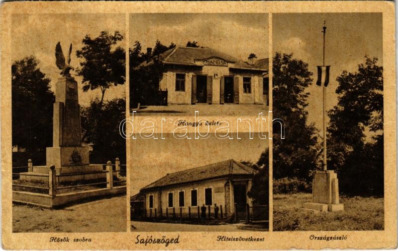 Leírás: 1944 Sajószöged, Hősök szobra, emlékmű, Országzászló, Hitelszövetkezet, Hangya Szövetkezet üzlete és saját kiadása (EK)