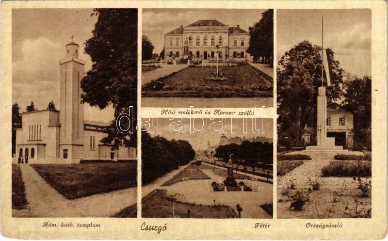 1948 Csurgó, Római katolikus templom, Hősi emlékmű, Korona szálloda, F... https://www.darabanth.com/hu/374-Gyorsarveres/374.0/Kepeslapok/Magyarorszag~2000004/1948-Csurgo-Romai-katolikus-templom-Hosi-emlekmu-Korona-szalloda-Fo-ter-Orszagzaszlo~II2187393
