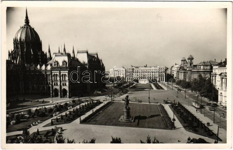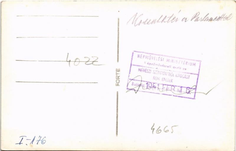 1951 Budapest V. Kossuth tér, Parlament. Hátoldalon "Népművelési Minisztérium Képzőművészeti osztálya művészi szempontból kifogást nem emelek" bélyegzés