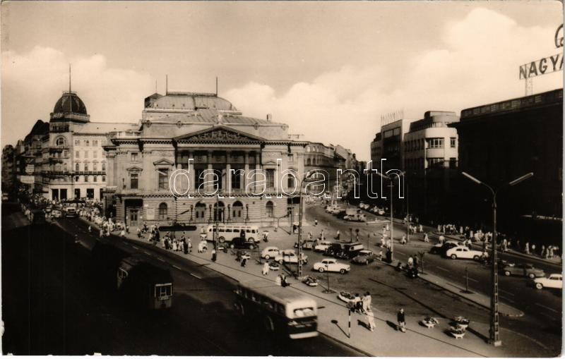 Leírás: ~1960 Budapest VIII. Blaha Lujza tér, villamosok, autóbuszok, Corvin nagyáruház, Közért, Nemzeti színház. Képzőművészeti Alap Kiadóvállalat