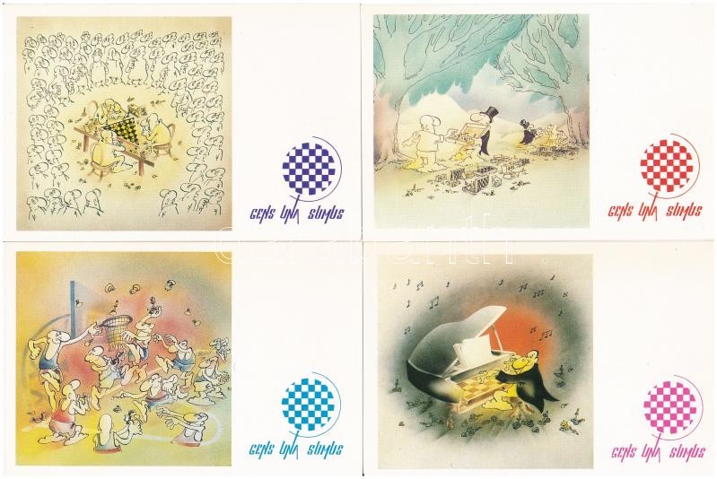 9 db MODERN motívum képeslap: Gens Una Sumus sakk sorozat, Jovan Prokopljevic szignóval / 9 modern Chess motive postcards: signed by Jovan Prokopljevic