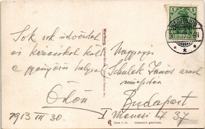 Leírás: Wartburg, Luther Stube. Serie I. 18. s: Berthold Pierson (Hátoldalon Schulek János építésznek címzett levél)