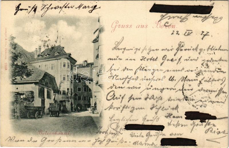 1897 (Vorläufer!) Bolzano, Bozen (Südtirol); Batzenhäusl / street view... https://www.darabanth.com/hu/374-Gyorsarveres/374.0/Kepeslapok/Olaszorszag~2000054/1897-Vorlaufer-Bolzano-Bozen-Sudtirol-Batzenhausl-street-view-inn~II2185579