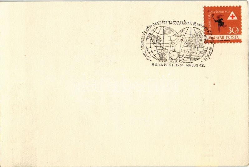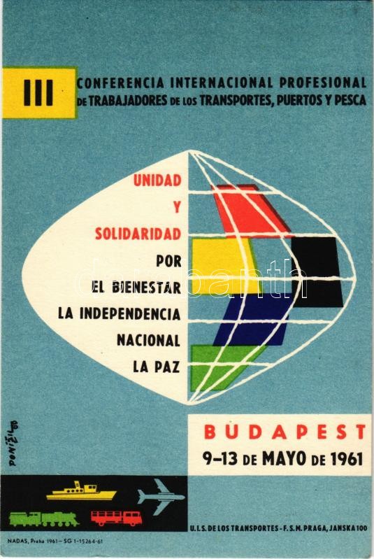 1961 III Conferencia Internacional Profesional de Trabajadores de los Transportes, Puertos y Pesca Budapest 9-13 de Mayo / SZVSZ. Vasutas és Közlekedési Tagozatának III. Nemzetközi Konferenciája / 3rd International Conference of Professional Transport, Port and Fishing Workers in Budapest s: Ponizil + So. Stpl.