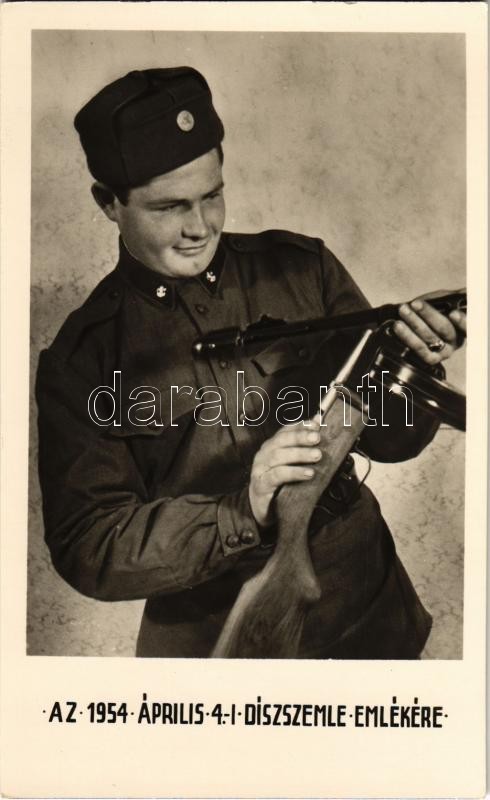 Az 1954. április 4-i díszszemle emlékére. Van hazánk, van mit megvéden... https://www.darabanth.com/hu/374-Gyorsarveres/374.0/Kepeslapok/Propaganda-politika~2000091/Az-1954-aprilis-4-i-diszszemle-emlekere-Van-hazank-van-mit-megvedenunk-Kepzomuveszeti~II2186605