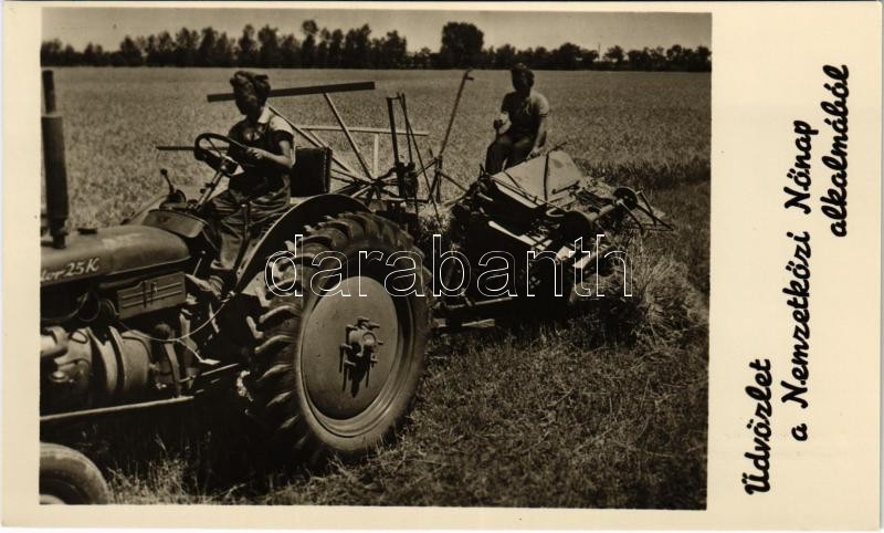 Üdvözlet a Nemzetközi Nőnap alkalmából! A mezőgazdaság fokozott gépesítésével a falun is megváltozott a nők munkájának jellege. Nők traktorral. Képzőművészeti Alap Kiadóvállalat / International Women's Day, Hungarian socialist propaganda, women with tractors
