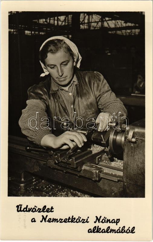 Üdvözlet a Nemzetközi Nőnap alkalmából! Hazánkban a nők magas minőségű munkát végeznek a nehézipar területén is. Képzőművészeti Alap Kiadóvállalat / International Women's Day, Hungarian socialist propaganda