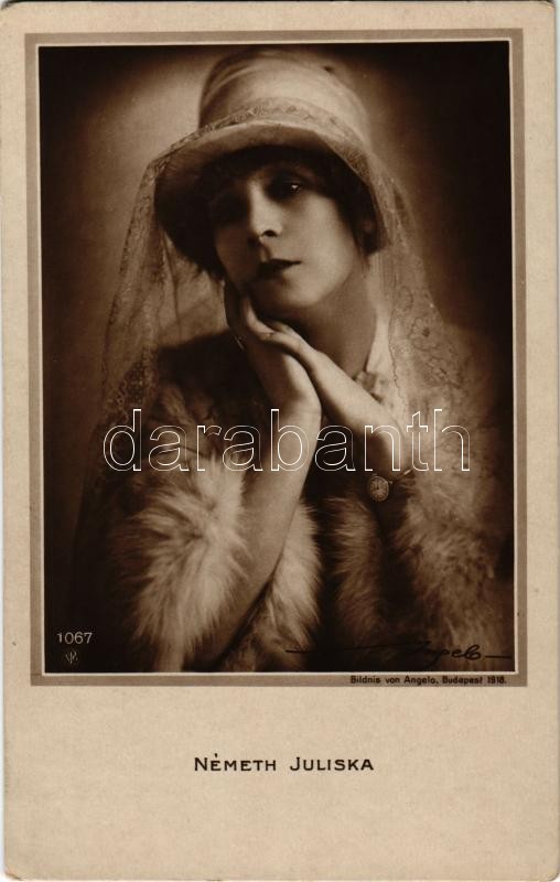 Németh Juliska. Angelo felvétele, Budapest 1918. N.P.G. 1067. (EK) https://www.darabanth.com/hu/374-Gyorsarveres/374.0/Kepeslapok/Szinesz~2000096/Nemeth-Juliska-Angelo-felvetele-Budapest-1918-NPG-1067-EK~II2184976
