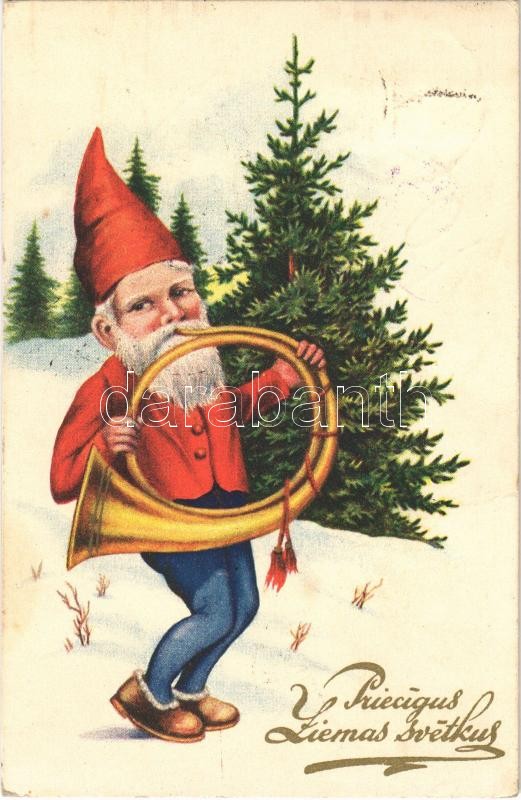 Leírás: 1935 Priecigus Ziemas svetkus / Lithuanian Christmas greeting card, winter holiday, dwarf