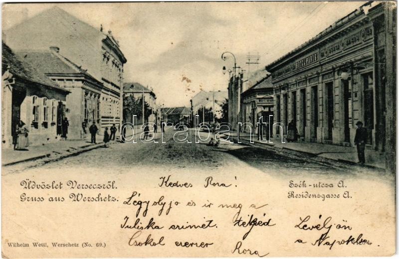 Leírás: 1901 Versec, Werschetz, Vrsac; Szék utca, Hotel Paris szálloda, üzlet. Wilhelm Wettl No. 69. / Residenzgasse / street view, hotel, shops (fl)