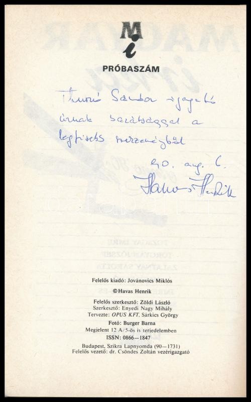 Leírás: Havas-Zöldi-Enyedi Nagy: Magyar Irka - Anno '90. H.n., é.n., Rakéta. Kiadói papírkötés, jó állapotban, Havas Henrik által dedikálva.